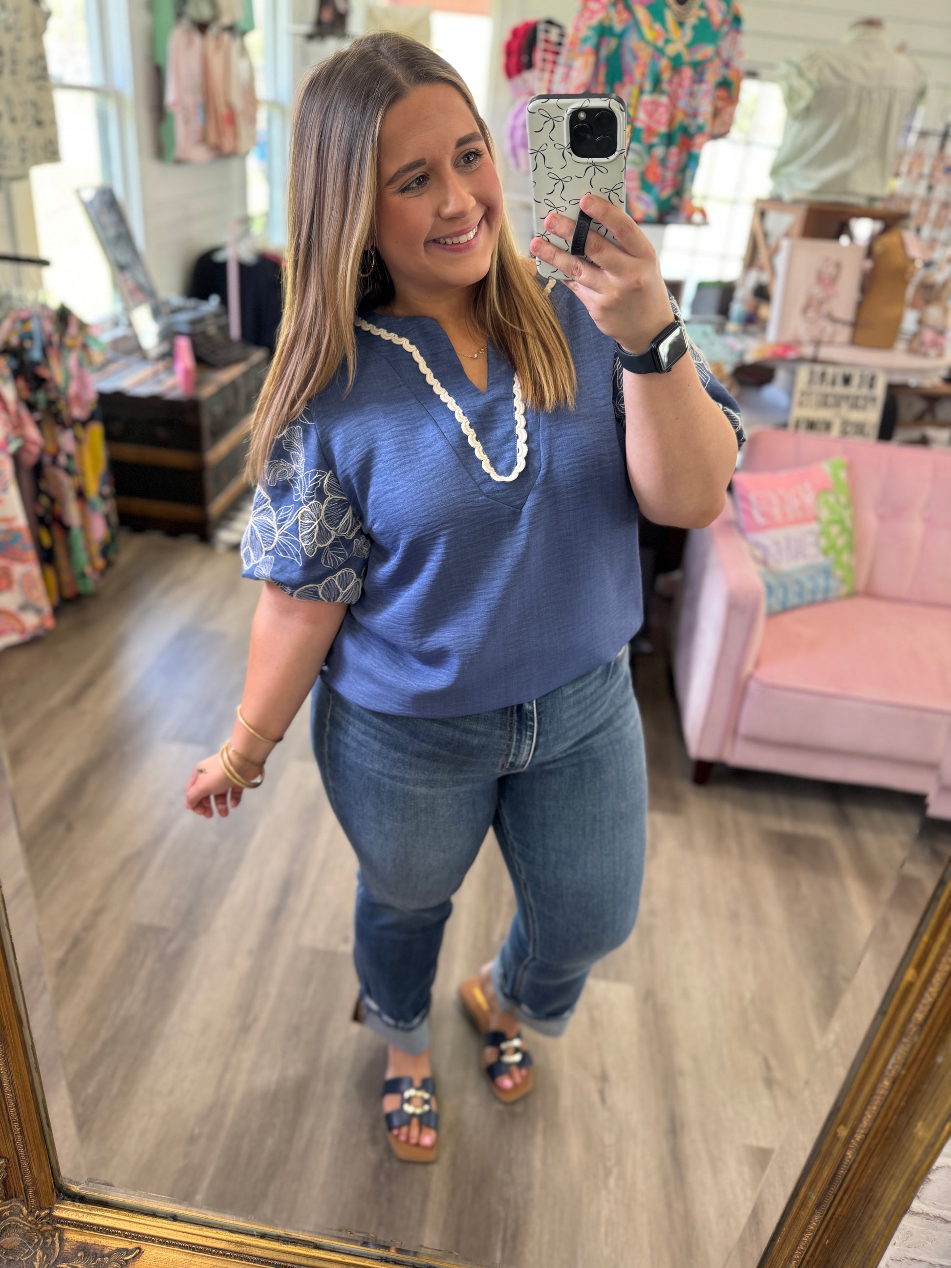 Lainey Embroidered Puff Sleeve Top-Denim Blue