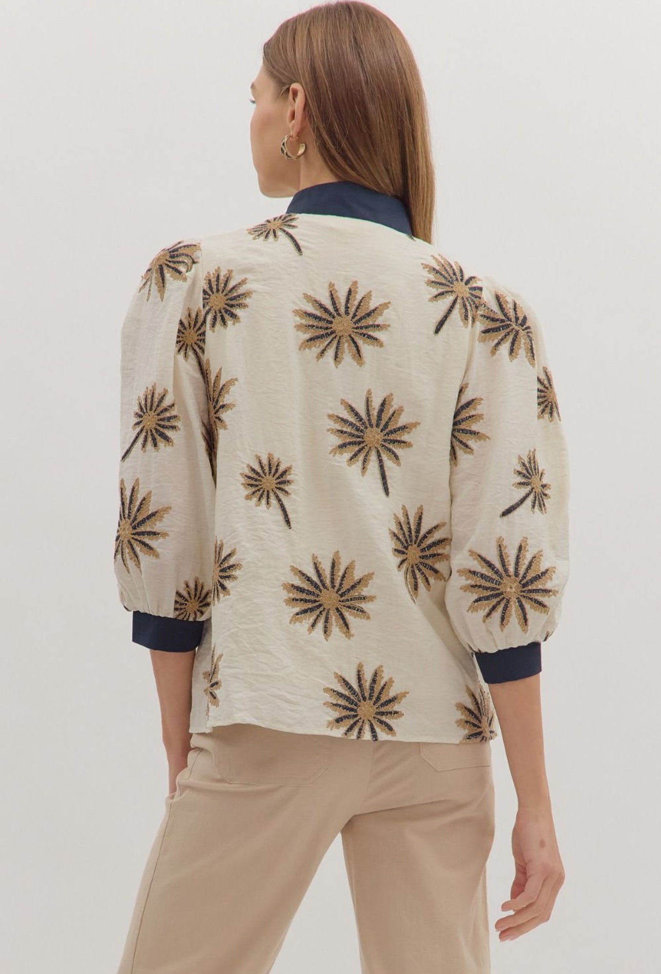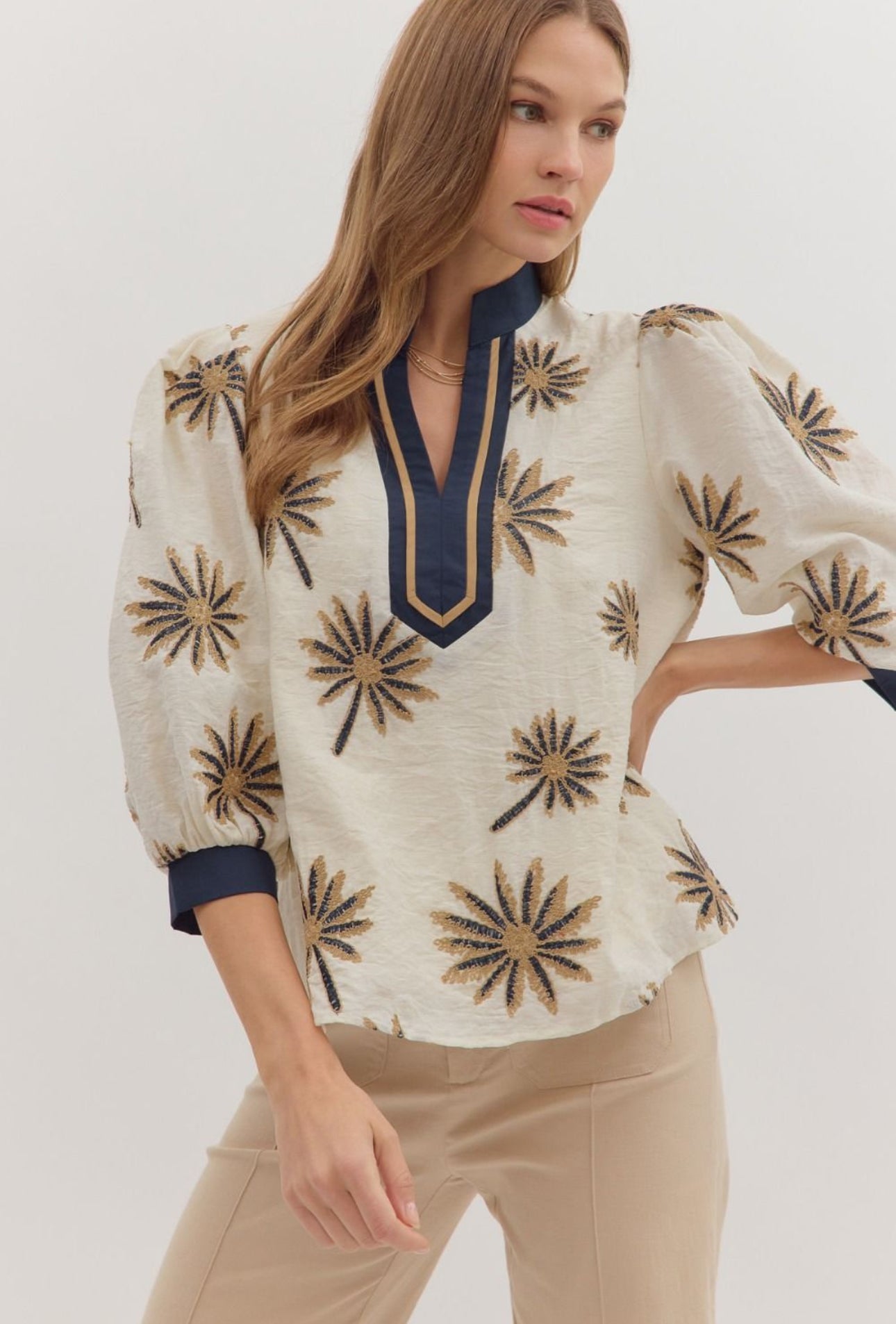 Details: Our Nina Top features delicate botanical embroidery and a flattering 3/4 puff sleeve design. The contrast V-neck band adds a stylish touch, while the lightweight woven fabric offers comfort without sheerness. Fully lined, it provides a smooth feel for all-day wear. Perfect for adding a fresh, elegant vibe to your wardrobe.